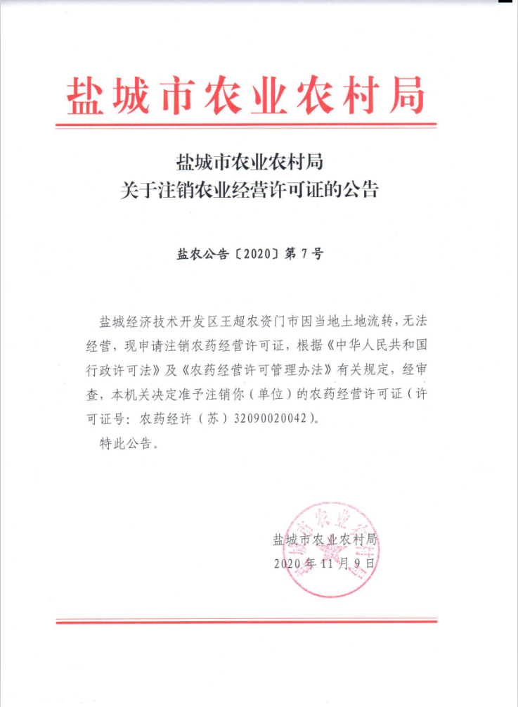 盐城市农业农村局关于注销农业经营许可证的公告 盐农公告〔2020〕第7号