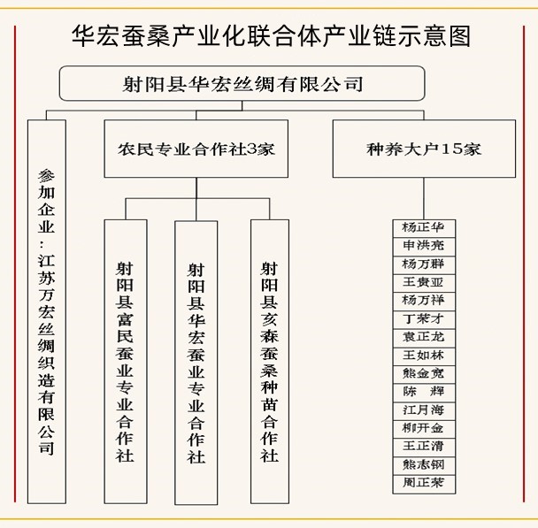 射阳县华宏蚕桑产业化联合体由农业产业化省级重点龙头企业--射阳县华宏丝绸有限公司(以下简称华宏公司)牵头,江苏万宏丝绸织造有限公司参与,射阳县华宏蚕业专业合作社、射阳县亥森蚕桑种苗合作社、射阳县富民蚕业专业合作社3家合作社,杨正华等15家养蚕大户组成。联合体坚持以“自愿平等、民主协商、合作共赢、创新发展”为原则,以“立足桑蚕、联农带农”为初心,以带动产业发展和农民增收为宗旨,通过为蚕农桑户提供优质蚕种、桑苗,新建养殖大棚、发放养蚕采桑的器具,开展养蚕技术、桑园种植技术业务培训,建设规模化集约化蚕桑基地,保价订单回收等统一服务,探索出了“联合体+基地+农户”全产业链发展模式,带动了周边村镇10000多户农户增收致富。联合体牵头企业生产的白厂丝被评为江苏省名牌产品,“鸿图”商标获江苏省著名商标。