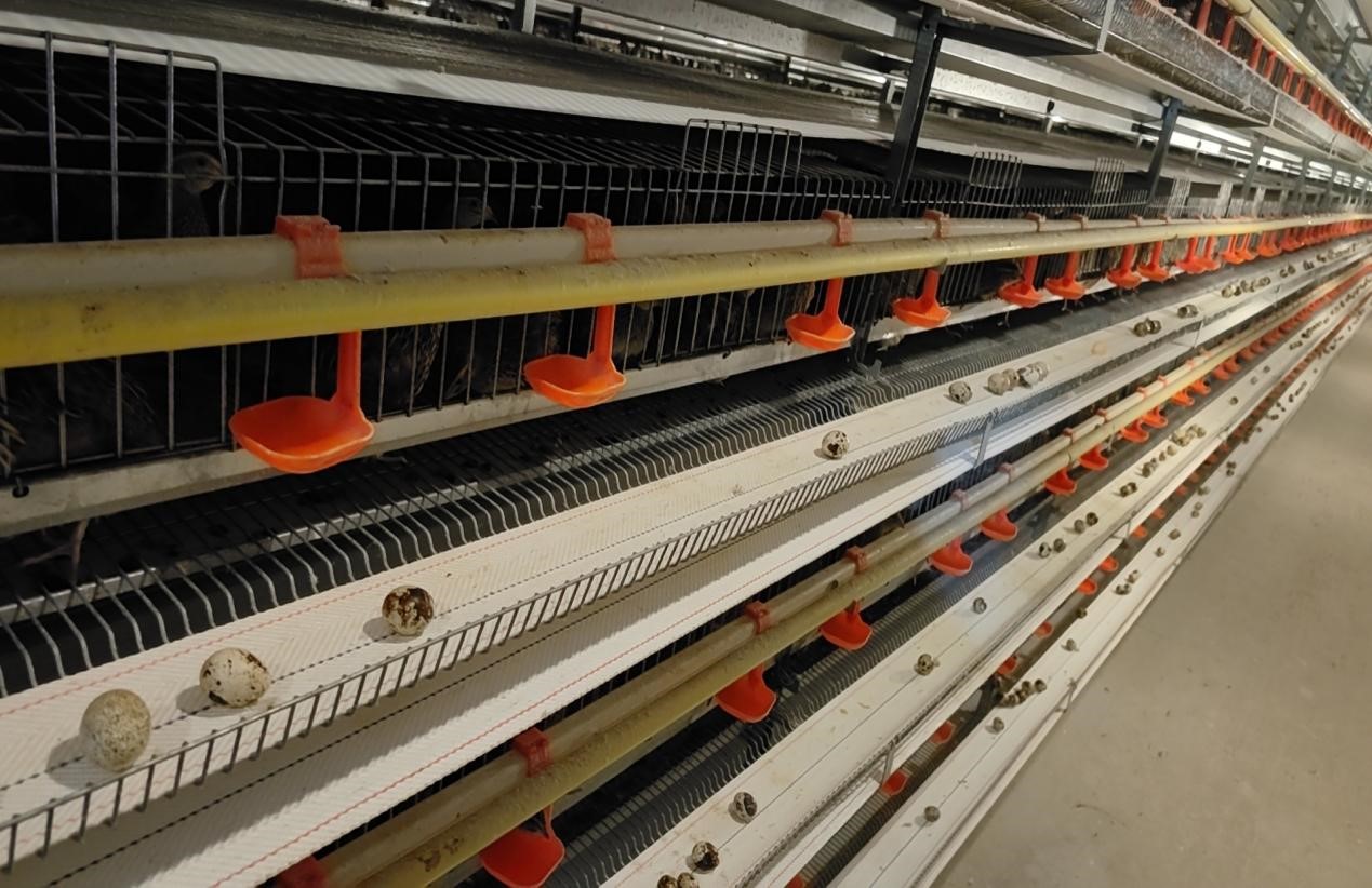 鹌鹑作为特禽养殖养殖周期12个月左右,首次产蛋时间35天左右,产蛋在80-100天达到高峰,育雏周期23天左右,产出的蛋重10-12g左右,目前饲养品种为褐鹌鹑,在浙江一带有育雏场,公司引进的为商品代。鹌鹑品种养殖相较于鸡等传统禽类养殖,具有抗病力强等优点。育成期养殖多采用全封闭式、笼养模式。车间安装自动喂料设备,目前尚无鹌鹑专用的饲料,鹌鹑营养标准,参考鸡的营养标准配制饲料。车间建立自来水供水系统,并连接饮水器,保证鹌鹑能时刻饮用干净无污染的水;配置清洁机械设备,运用高压冲洗机,在养殖区建立高压冲洗系统;购置了轴流通风机,利用喷雾降温系统,确保养殖区空气流通;设置了喷雾消毒系统,确保养殖区能定时喷雾消毒;购置搅料机、粉碎机来用于饲料加工工作,并根据饲料成分、营养配比等,按照鹌鹑不同生长期营养需求来选择合适的饲料配方;通过购置干料输送机械来实现自动化喂料。有利于提高机械化自控效率与水平。