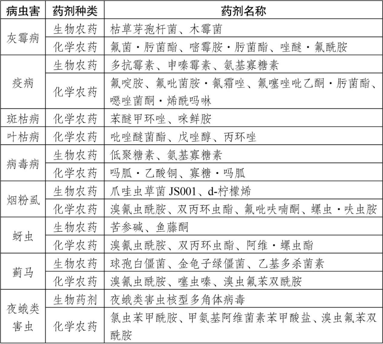 在病虫害发生初期,或临近蔬菜采收的关键时期,优先选用生物农药进行防控。防治烟粉虱等害虫时,可喷施爪哇虫草菌JS001、d-柠檬烯等生物药剂;预防灰霉病、病毒病等病害时,则可选用枯草芽孢杆菌、木霉菌、盐酸吗啉胍等生物制剂,在保障防控效果的同时降低农药残留风险。