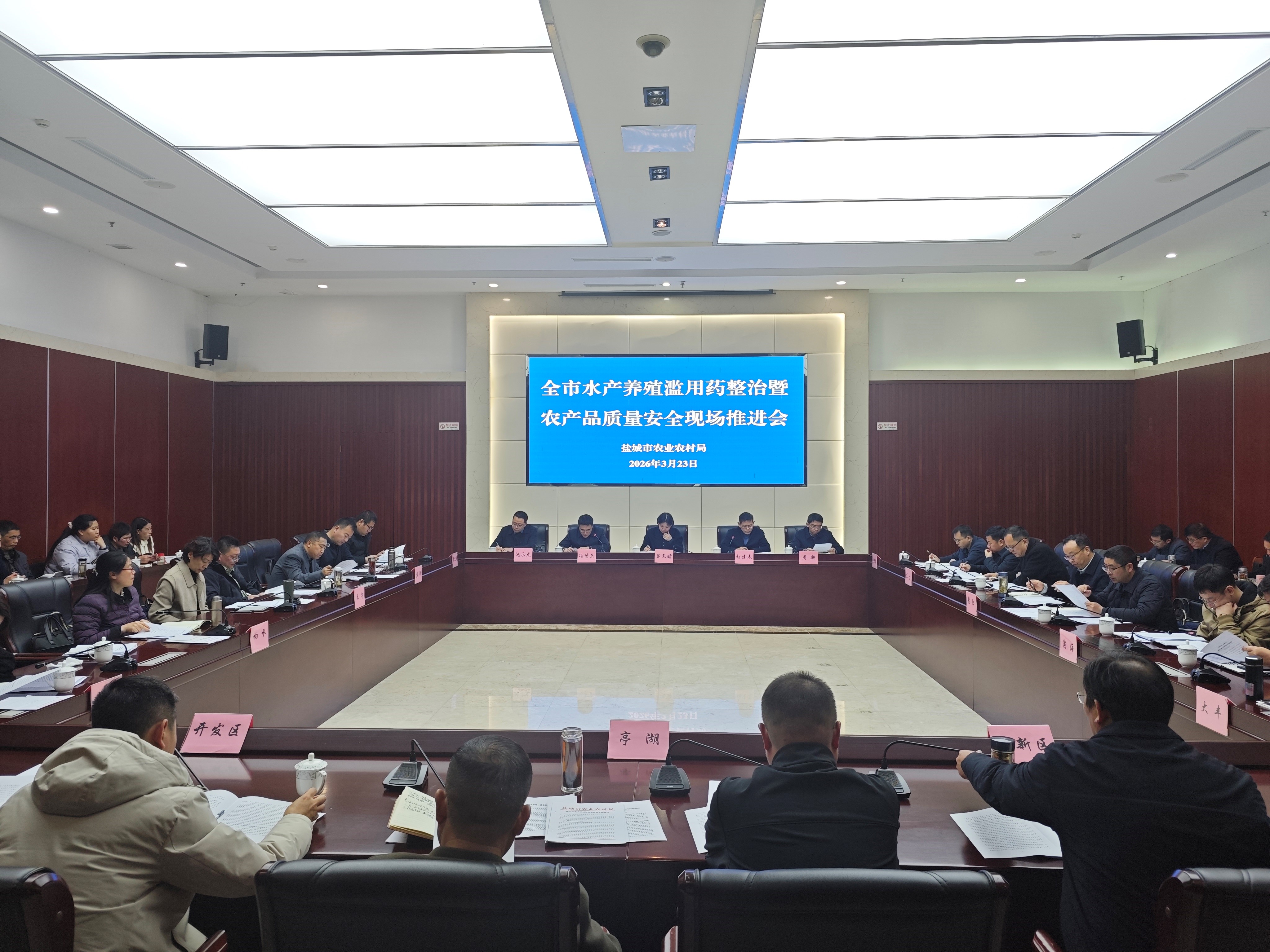 各县(市、区)农业农村局农产品质量安全分管负责同志、水产品质量安全专班负责同志、农产品质量安全监管科科长、畜牧兽医科科长及市农业农村局相关处室负责同志共50余人参加了会议。会上发放了《水产养殖滥用药专项整治三年行动实施方案》《2026年盐城市农产品质量安全监管工作要点》《盐城市重点问题水产品质量安全监管工作提醒》《2026年盐城市农产品质量安全监测方案》等文件。
